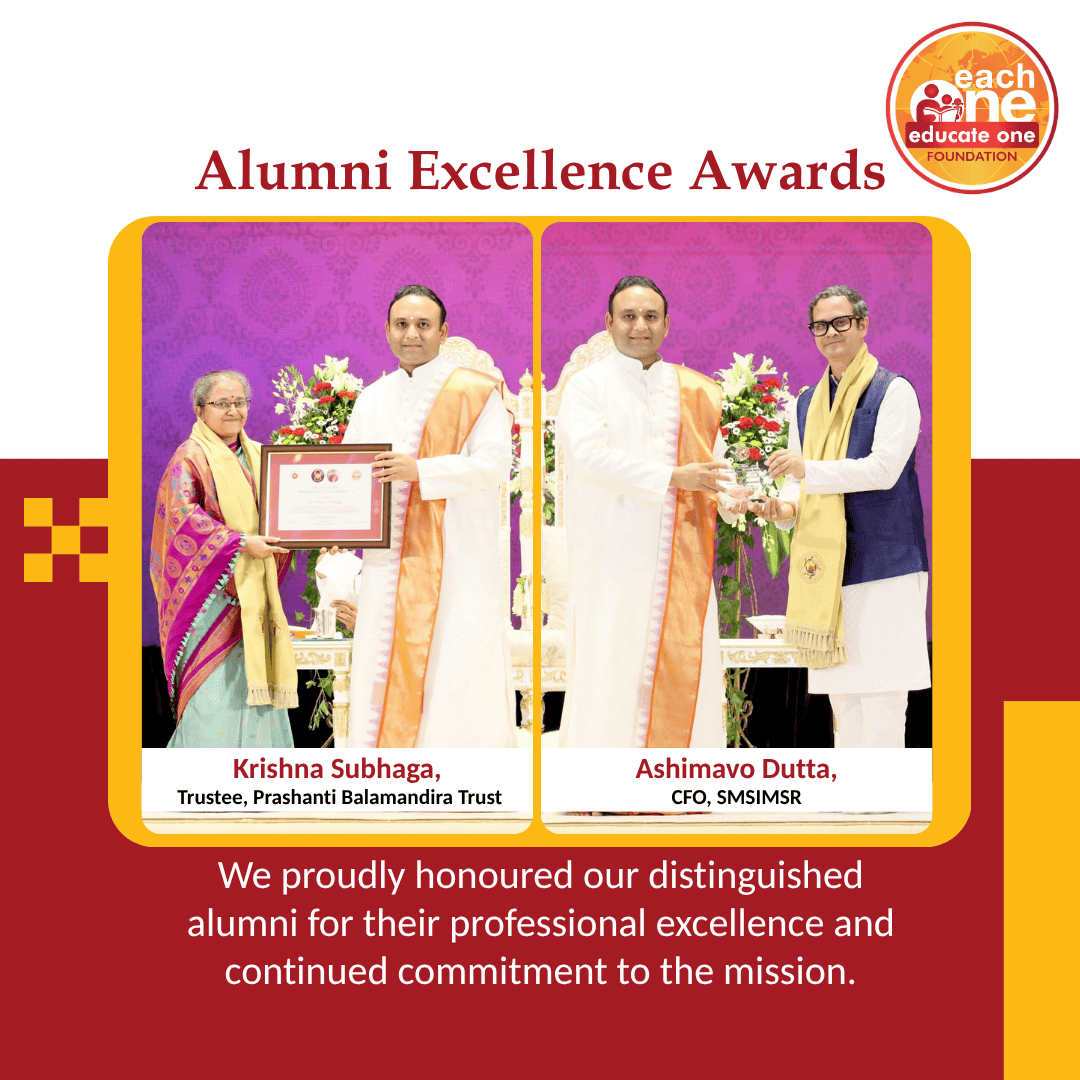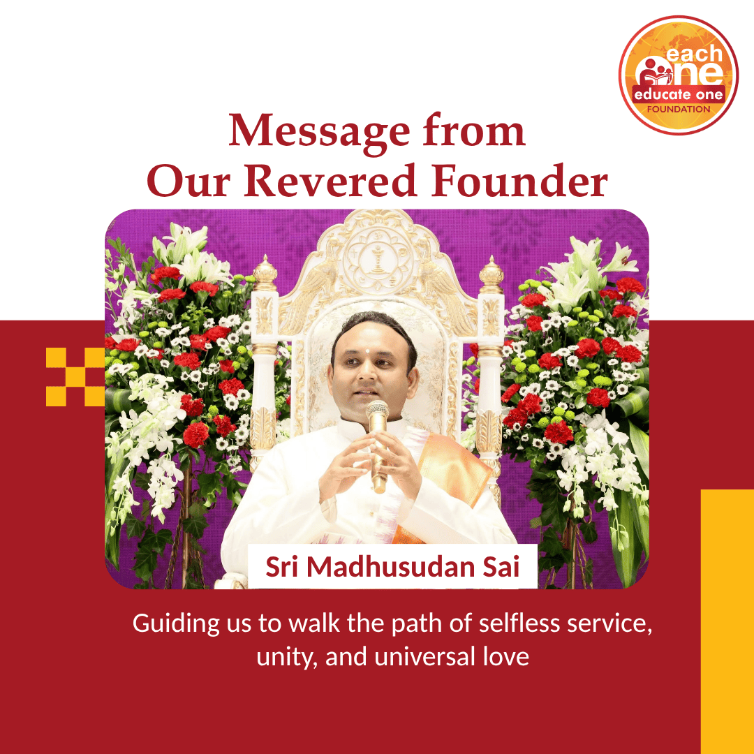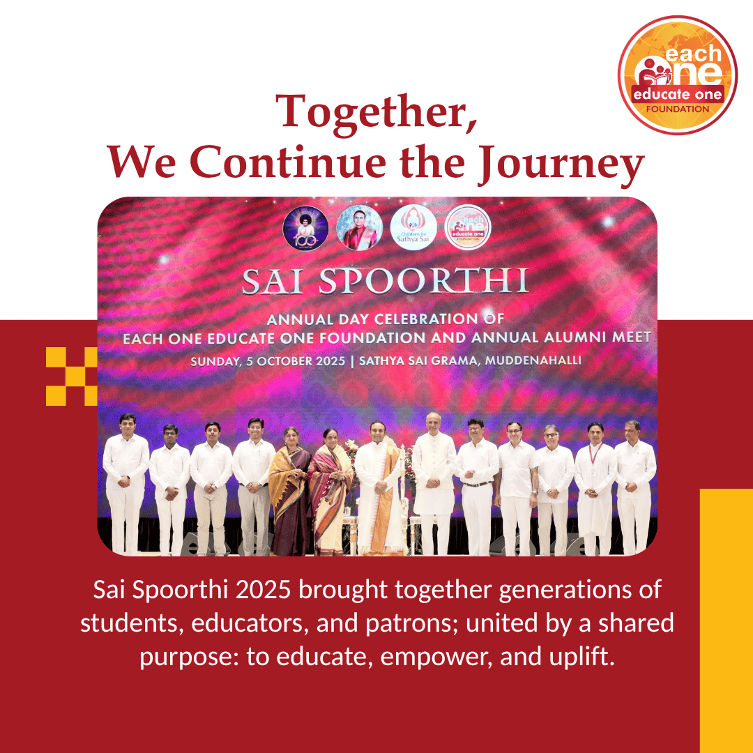 On 05 October 2025, Sai Spoorthi 2025 – the Annual Alumni Meet and the Annual Day Celebration of the Each One Educate One Foundation – brought together generations of students, alumni, and patrons in the presence of our Revered Founder Sri Madhusudan Sai. A day filled with gratitude and inspiration, it celebrated the spirit of service, learning, and love that continues to guide this mission of education and transformation.