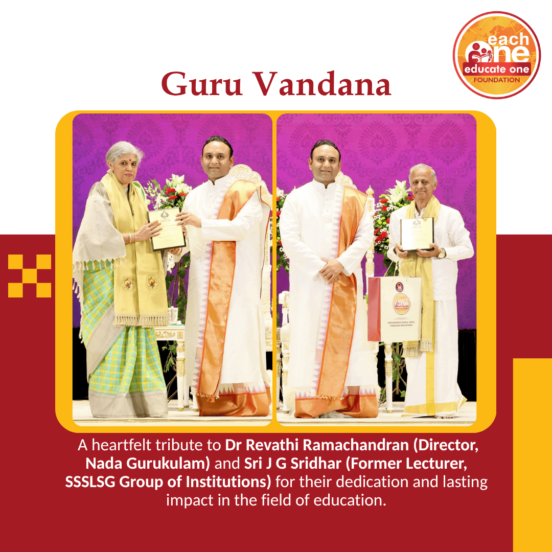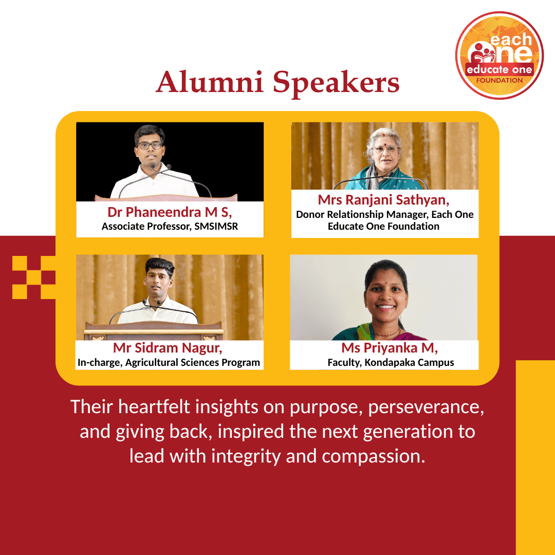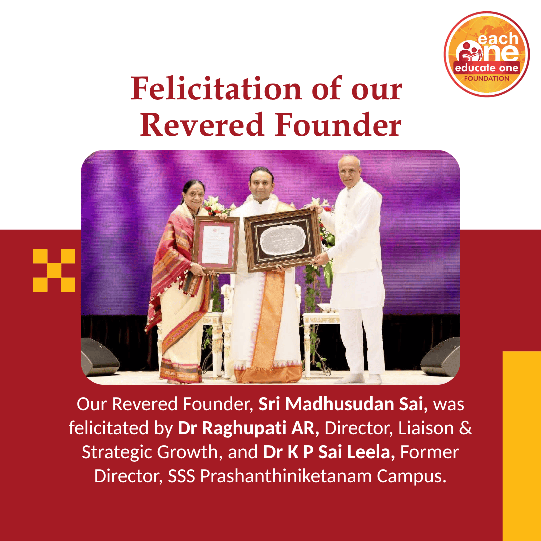 On 05 October 2025, Sai Spoorthi 2025 – the Annual Alumni Meet and the Annual Day Celebration of the Each One Educate One Foundation – brought together generations of students, alumni, and patrons in the presence of our Revered Founder Sri Madhusudan Sai. A day filled with gratitude and inspiration, it celebrated the spirit of service, learning, and love that continues to guide this mission of education and transformation.
